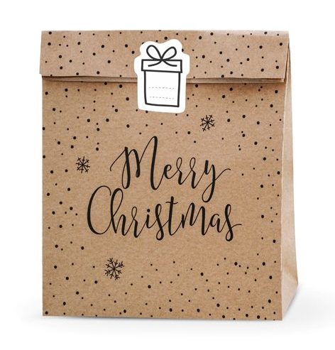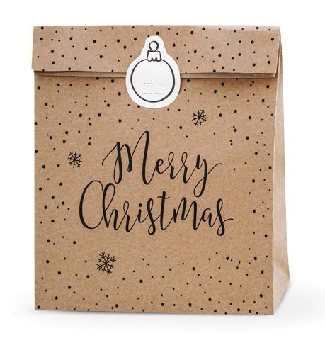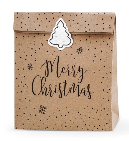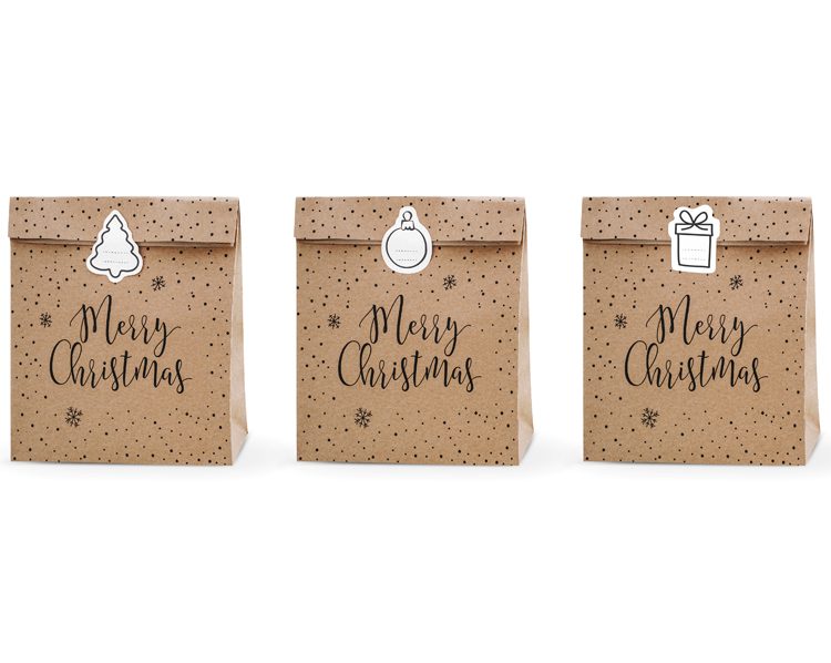 Pack de 3 bolsas kraf con el letterig «Merry Christmas». Cada bolsa va con una pegatina, hay tres modelos cajita de regalo, arbolito de navidad y bola de navidad