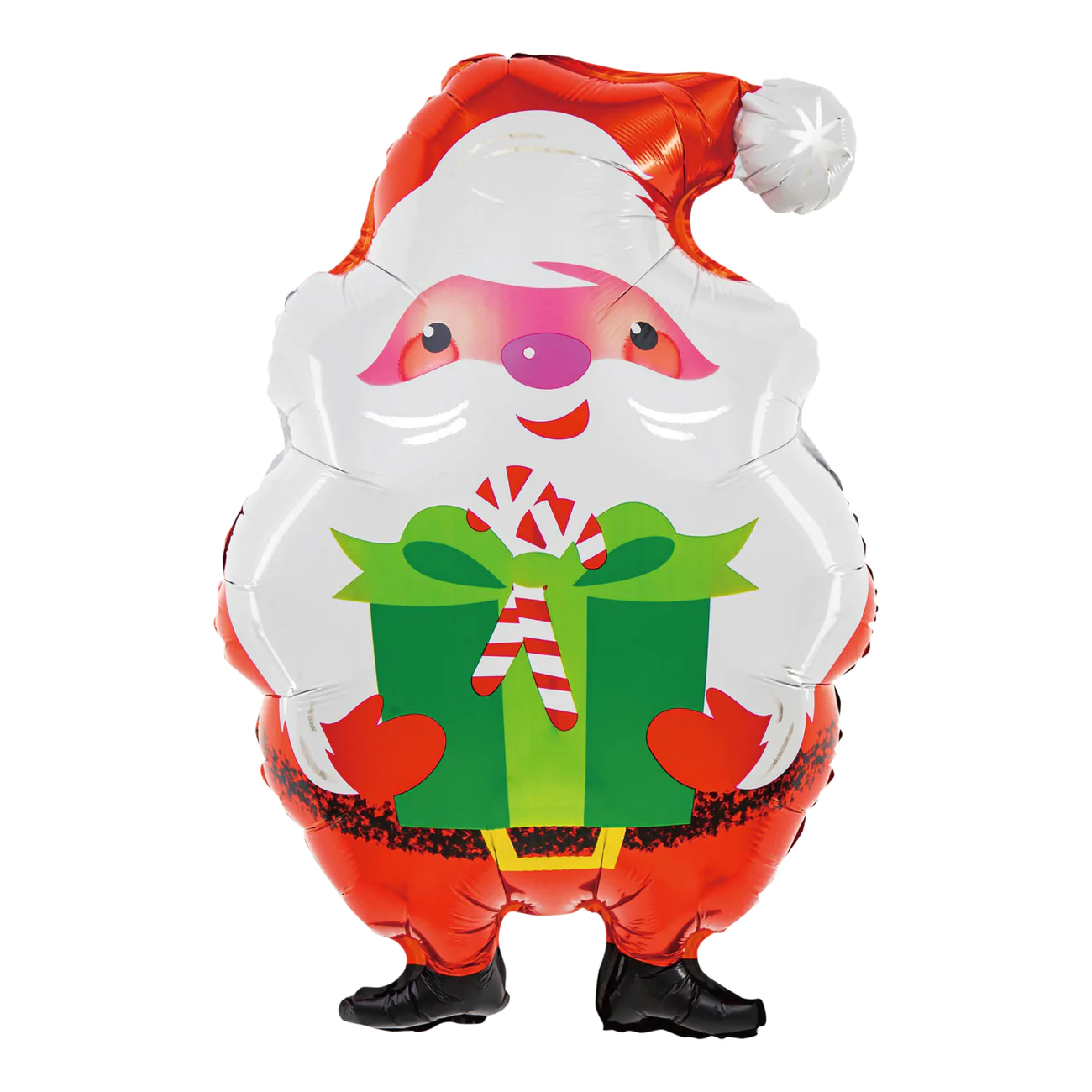 El globo de aluminio perfecto para la decoración navideña, Papá Noel con ropa roja tradicional, guantes rojos y un sombrero con pompón, sostiene en sus manos un gran regalo verde decorado con una cinta. Todos los niños estarán encantados.