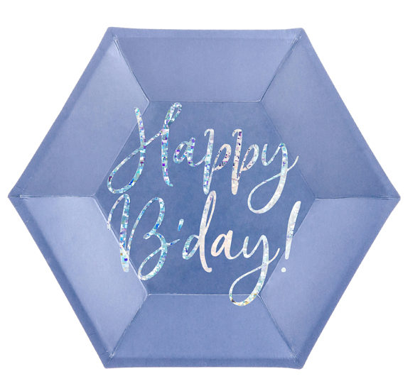 Pack de 6 platos con forma hexagonal en color azul y la frase Happy Birthday en brillo iridiscente.