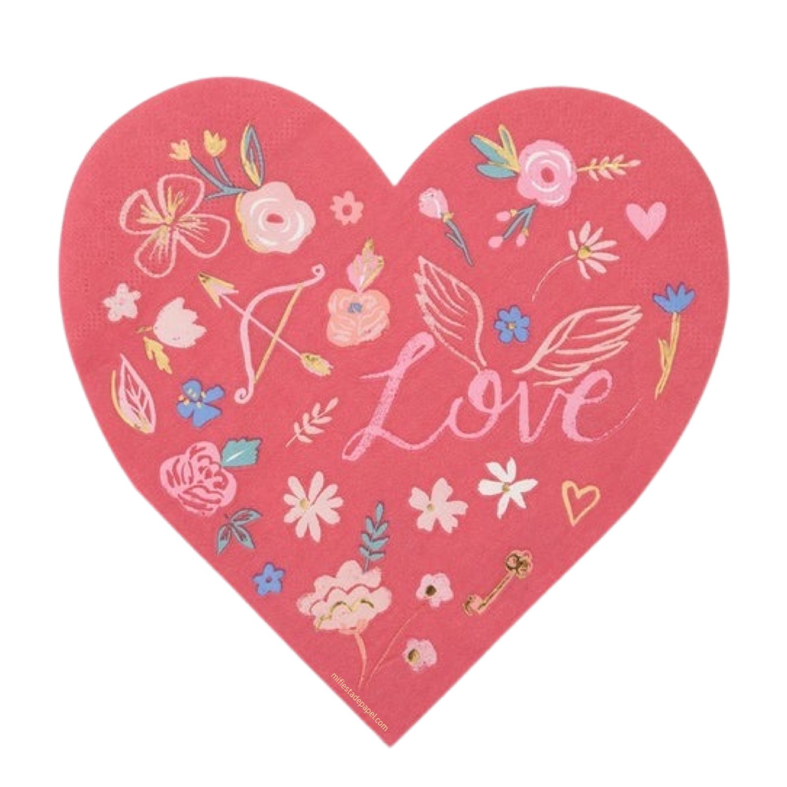 Preciosas servilletas con forma de corazón rojo y bonitas ilustraciones de flores, corazones y el arco de Cupido están en tonos rosas y azules. El detalle de lámina dorada le da un toque elegante.